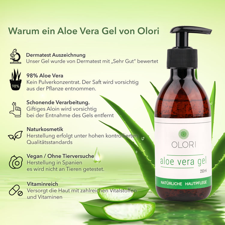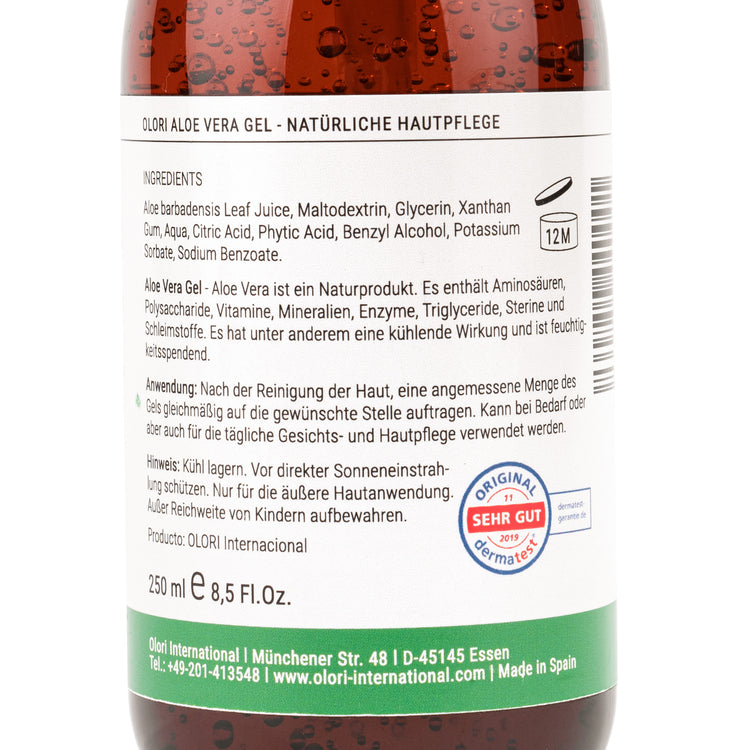 Das von den Kanarischen Inseln stammende OLORI Aloe Vera Gel überzeugt mit Bio-Qualität und höchster Reinheit, die ganz ohne Zusatzstoffe auskommt. Zusätzlich trägt das OLORI Aloe Vera Gel den DERMATEST Gütesiegel. Seine Hautverträglichkeit ist also dermatologisch mit Sehr Gut bestätigt.